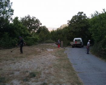 Zaposleni u Sektoru za održavanje lokalnih puteva, Komunalno Stambenog doo, kose putni pojas i skidaju ramene grane koje su se nadvile iznad puta Sasovići – Lastva