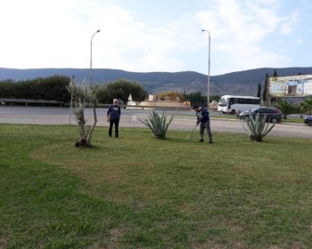 Zaposleni u Sektoru za održavanje zelenih površina, Komunalno Stambenog doo, kose uređenu zelenu površini na Petlji u Igalu