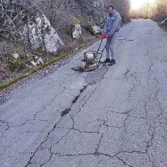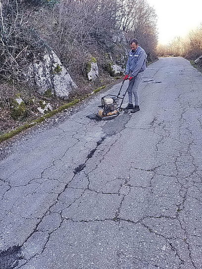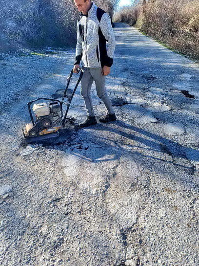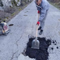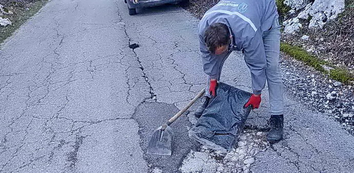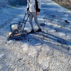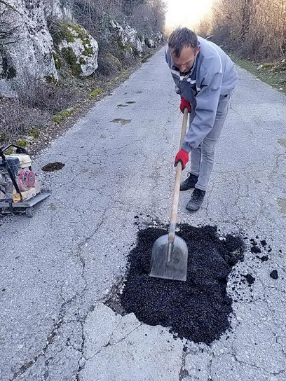 Zaposleni u sektoru za održavanje lokalnih puteva i vodotokova Komunalno Stambenog doo, zimska ekipa, završavali su sanaciju oštećenja, udarnih rupa, hladnim asfaltom u zaleđu prema Dizdarici.